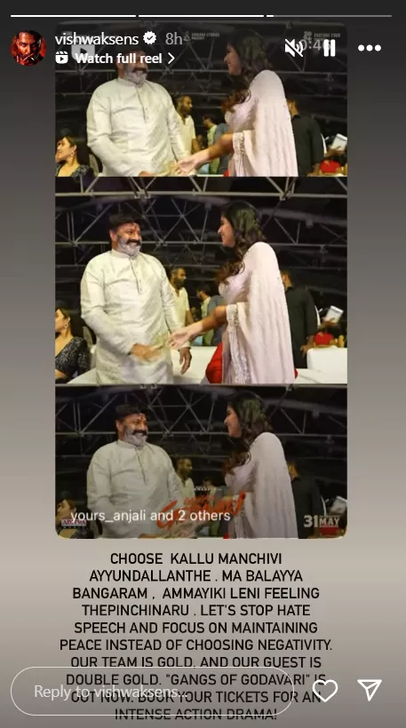 Anjali’s Gangs Of Godavari co-star, Vishwak Sen also tried to defend Nandamuri Balakrishna regarding the incident. He took to his Instagram stories to share his thoughts on the matter. He asked people to stop the hate speech. Vishwak also mentioned that his team is gold and their guest, Nandamuri is ‘double gold’.