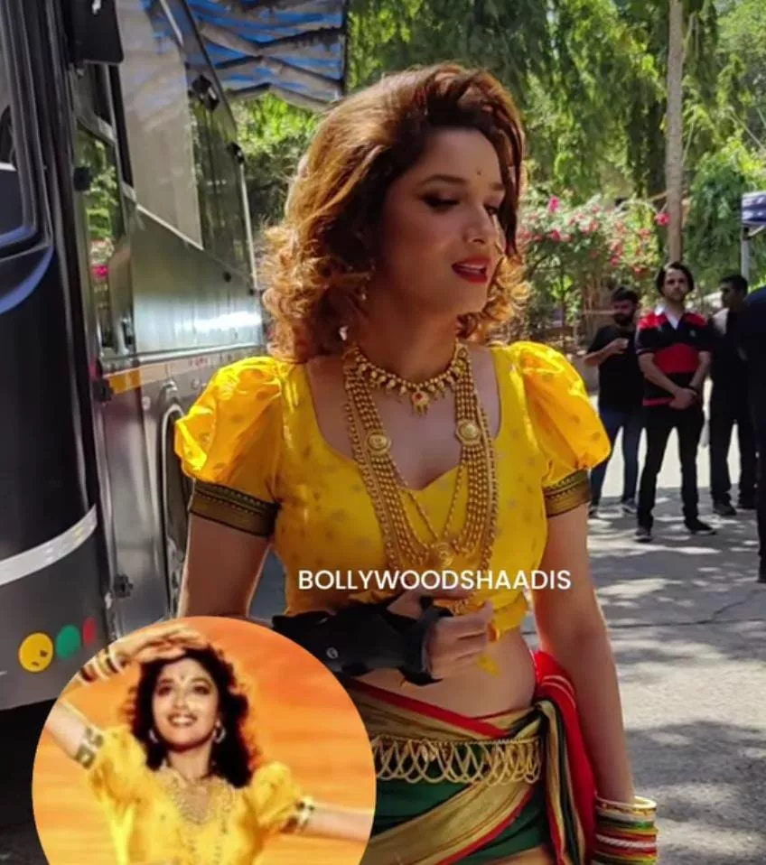 Ankita Lokhande left the hearts of her fans to melt as she was recently spotted at Dance Deewane's set. For the day, the actress recreated an iconic look of Madhuri Dixit from the song, Humko Aj Kal Hai of the movie, Sailaab. The diva opted for a yellow-hued crop top featuring golden work all over. She teamed the top with green-toned dhoti pants featuring red borders. A double-layered golden neckpiece and a Brahmi nath amped her look. Open curly tresses and a soft touch of makeup enhanced her glow. Well, there's no denying the fact that Ankita aced in the recreation of Madhuri's iconic look.