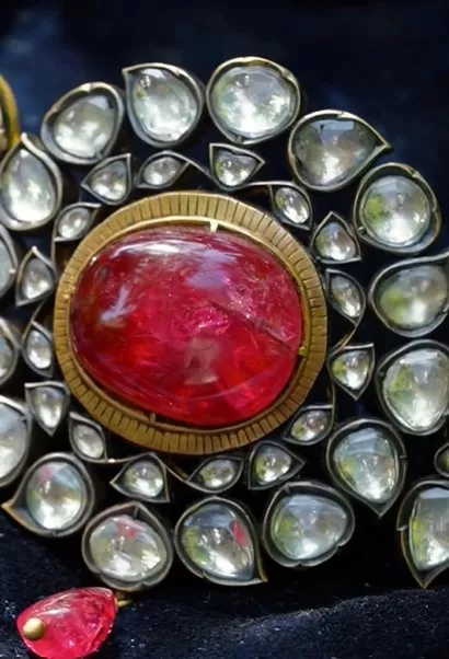 Talking about Deepika Padukone’s jewellery, the actress wore a choker necklace with white sapphires and rubby. The choker was originally a bazuband from the Sikh empire, which is a testament to Sikh craftsmanship. The centrepiece of the bazuband had a remarkable similarity to the Timur ruby, originally worn by Maharaja Ranjit Singh. The bazuband is currently preserved in the collection of Chand Begum jewels.