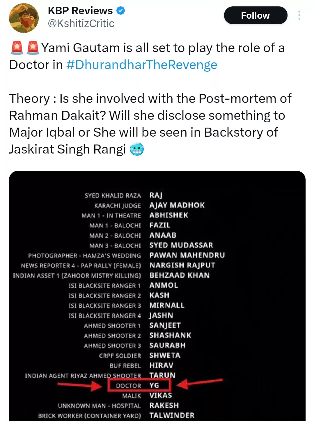 Previously, speculations of Yami's casting in her husband's upcoming movie were making rounds. Now, with the viral screenshot circulating online, several fan-made theories regarding her role surfaced. "Theory : Is she involved with the Post-mortem of Rahman Dakait? Will she disclose something to Major Iqbal or She will be seen in Backstory of Jaskirat Singh Rangi," the original poster wrote. Another user replied to the post and stated, "This is not a leak brother this is true I have read the whole credits. Thoda aas paas dekho na toh aap upar vi padhna Zahoor Mistry ki killing ka vi credit hai yeh part 1 mein hi part 2 ke dediye hue the credits."