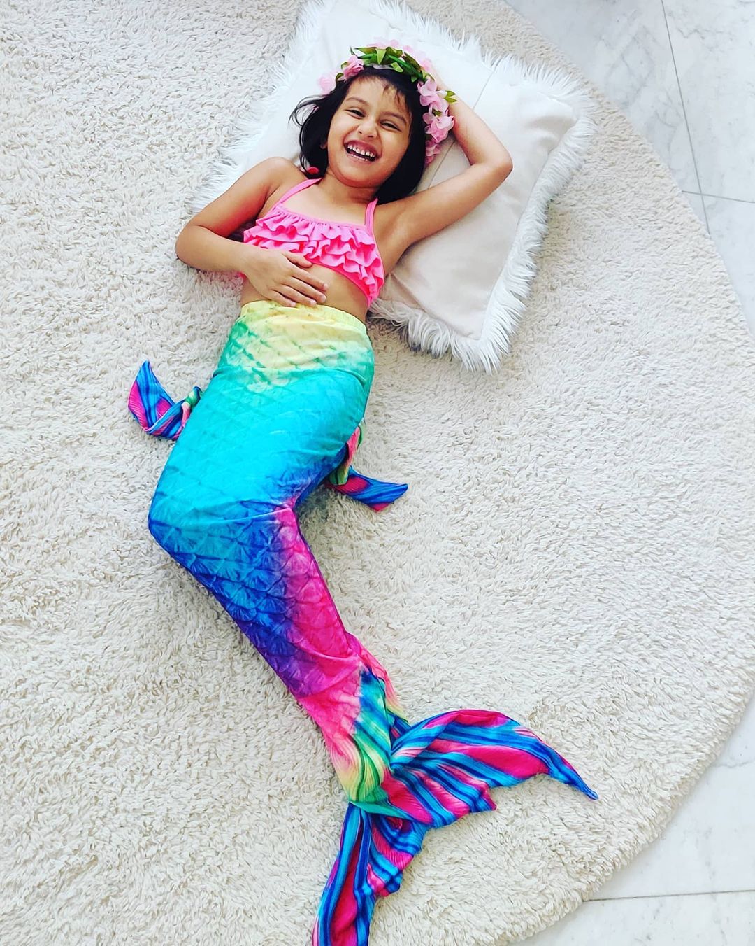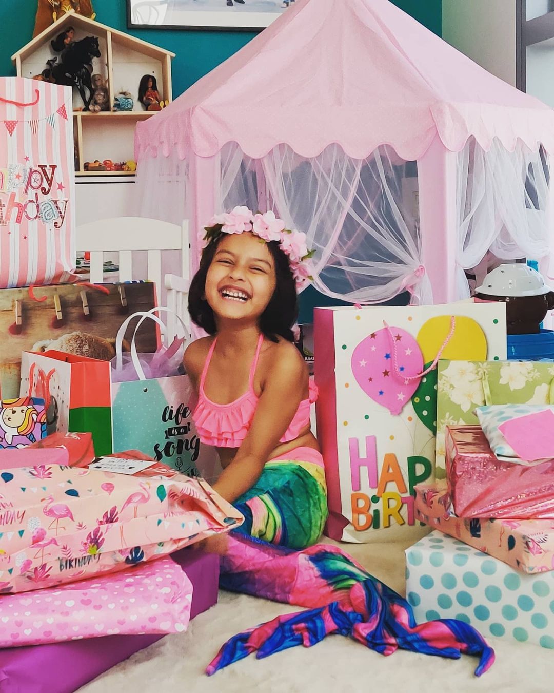 "One little mermaid is 5 today... and she can't stop smiling! Happy birthday my sunshine...momma is a total wuss today!"