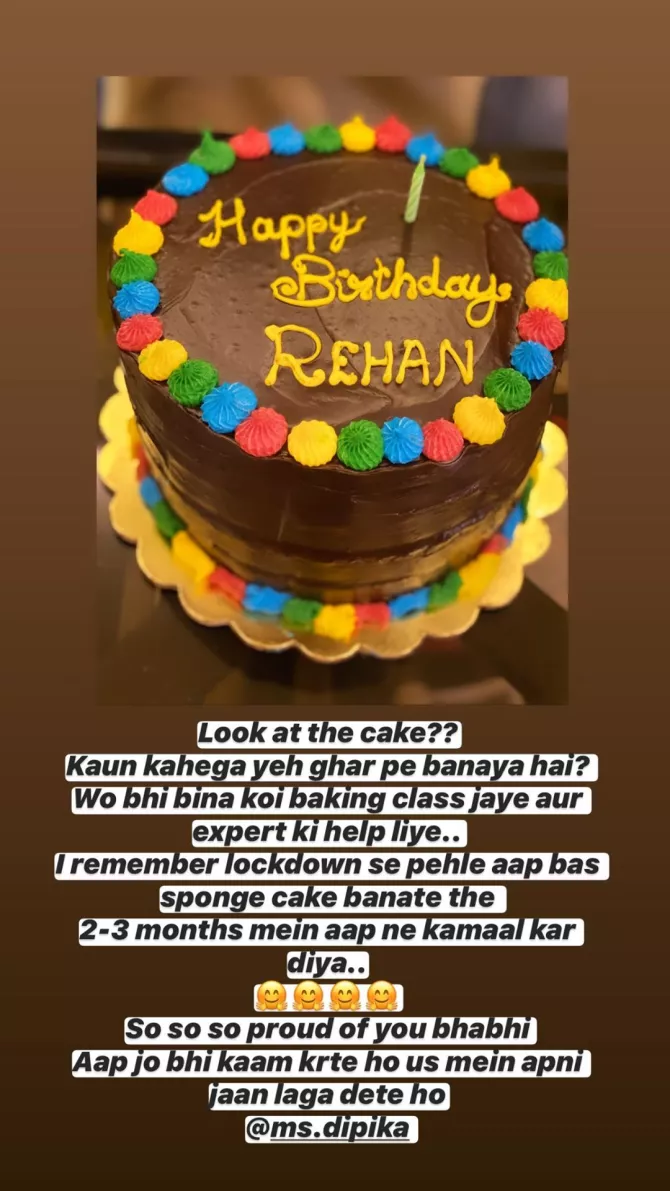A couple of weeks ago, Dipika's sister-in-law, Saba had taken to her IG stories to praise the young baker, who is baking expert level cakes without any training. Saba had shared an appreciation note for her bhabhi as she had posted a picture of a yummy looking cake, and it was captioned as "Look at the cake? Kaun kahega yeh gear banaya hai? Wo bhi bina koi baking class jaye aur expert ki help liye. I remember lockdown se pahle aap bas sponge cake banate the. 2-3 months mein apne kaamal kar diya. So so so proud of you bhabhi. Aap jo bhi kaam karte ho us mein apni jaan laga dete ho. @msdipika." (Recommended Read: Shabana Azmi Reveals That Javed Akhtar Is Happiest When He Is With His Granddaughters)