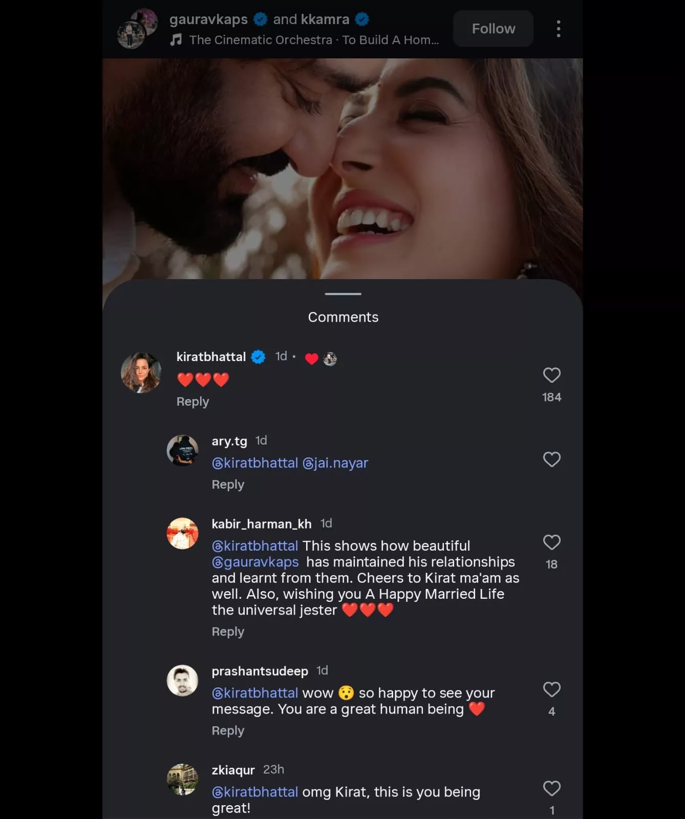 Kirat's like and comment on Gaurav Kapur's social media post about his marriage won over their fans' hearts. They were happy about the respectful relationship Gaurav maintained with Kirat, even after their 2021 divorce. "This shows how beautiful @gauravkaps has maintained his relationships and learnt from them. Cheers to Kirat ma'am as well. Also, wishing you A Happy Married Life the universal jester," a fan wrote. Another stated, "@kiratbhattal wow so happy to see your message. You are a great human being." A third mentioned, "@kiratbhattal omg Kirat, this is you being great!" It is rare to see such public display of support between former spouses and Kirat and Gaurav served as an exemplary in this regard.