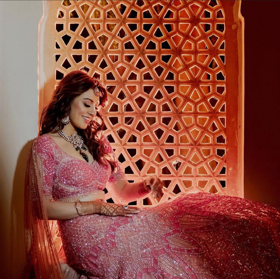 Hansika Motwani opted for a stunning peach-hued lehenga from the shelves of Falguni Shane Peacock, and she looked like a vision to behold. Her lehenga featured intricate embroidery all over it, and it was heavily embellished with pink-hued sequins and stones. The then-bride-to-be paired her skirt with a semi-sleeved matching choli, which had a similar embroidery work on it. Her blouse also featured drop bead detailing on its hem, which added an oomph actor to her overall look.