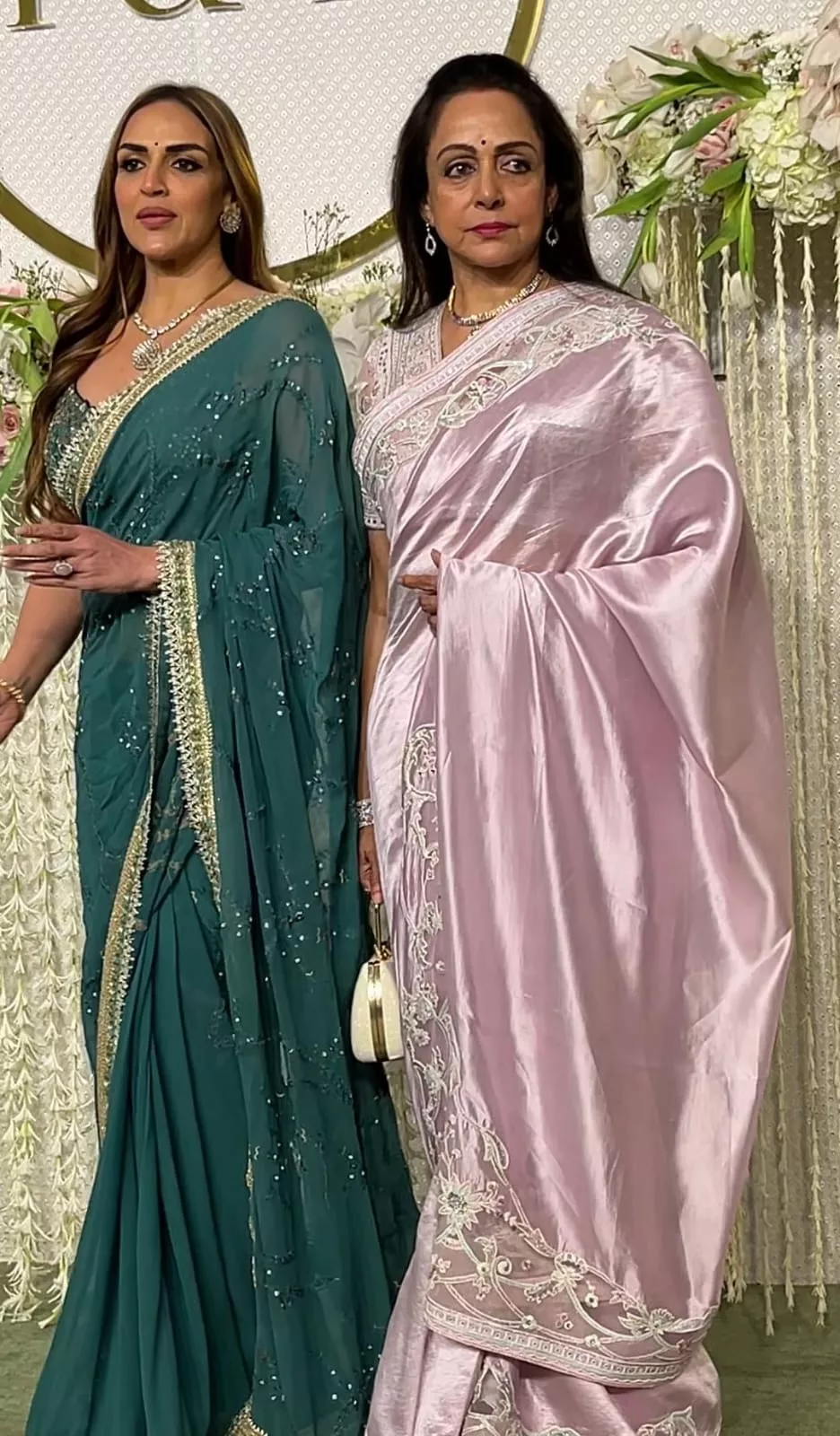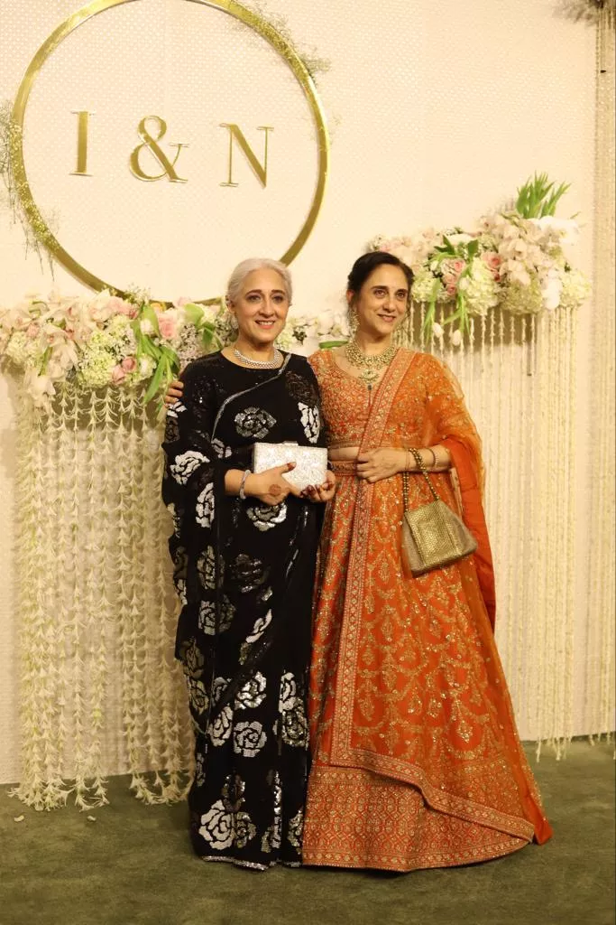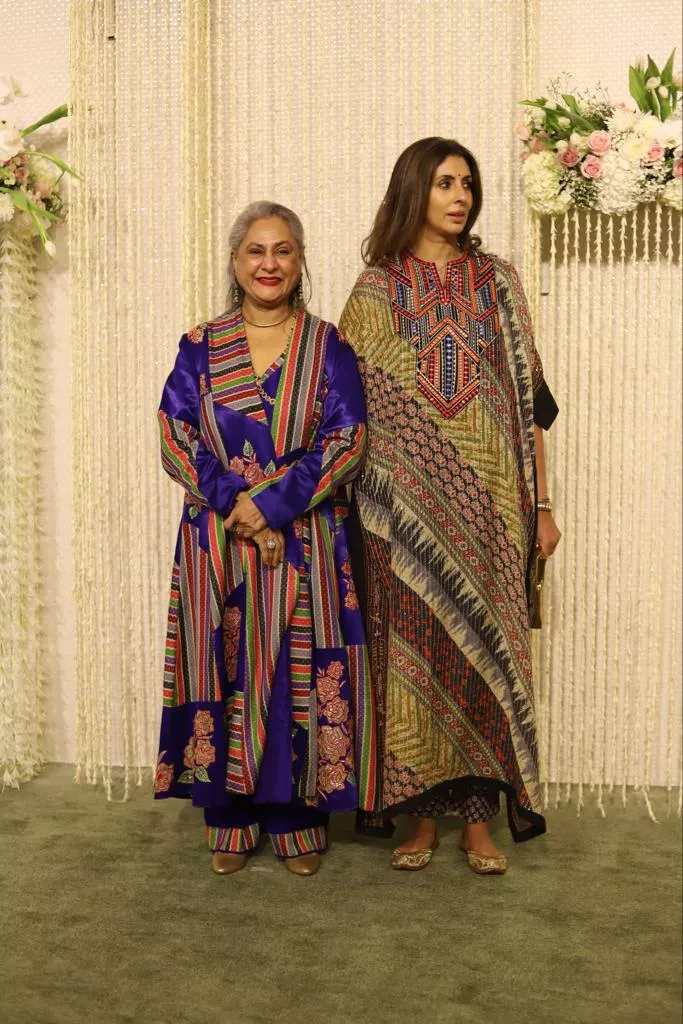 At first, we spotted Jaya Bachchan posing for the paps stationed outside Ira Khan and Nupur Shikhare's grand reception party at the NMACC in Mumbai on January 13, 2024. In one of the pictures shared by the paps, Jaya was seen brimming with joy and flaunting her million-dollar smile, which is rarely seen during her interactions with the paps. She looked gorgeous in a blue-based multi-hued ensemble, paired with rosy pink lipstick and dainty earrings. Beside her, we can spot her daughter, Shweta Bachchan, looking stunning in a kaftan dress. She teamed her look with subtle makeup, including a bindi and nude lipstick.