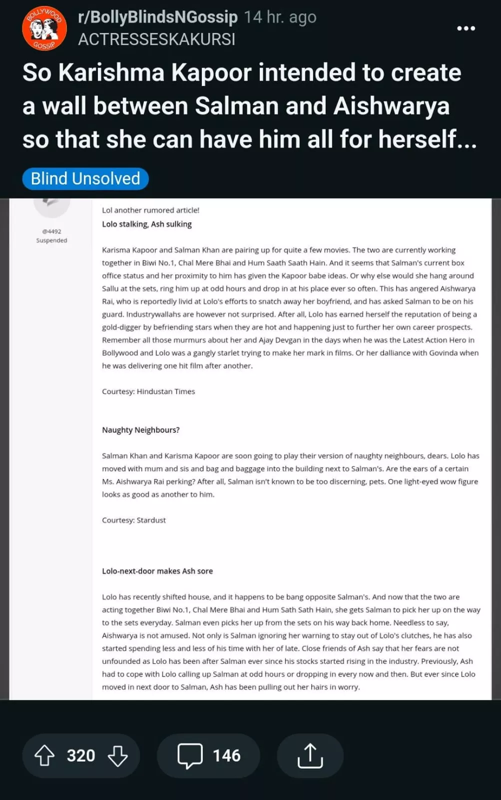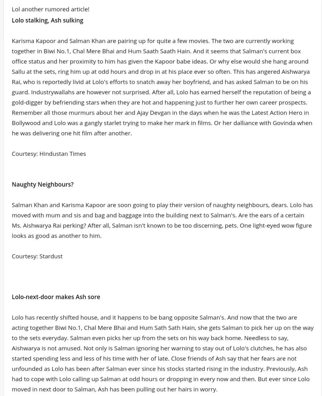 In the piece of writeup, it was mentioned that Karishma would ring Salman at odd hours and drop in at his place very often, which angered Aishwarya. Then, the Taal actress also warned Salman. Following this, the writeup called Karishma a 'gold-digger' and claimed that she was after Salman after his box-office success and rising stock numbers. At the end, it was written that since the time Karishma moved in front on Salman's residence, Aishwarya started getting more worried.