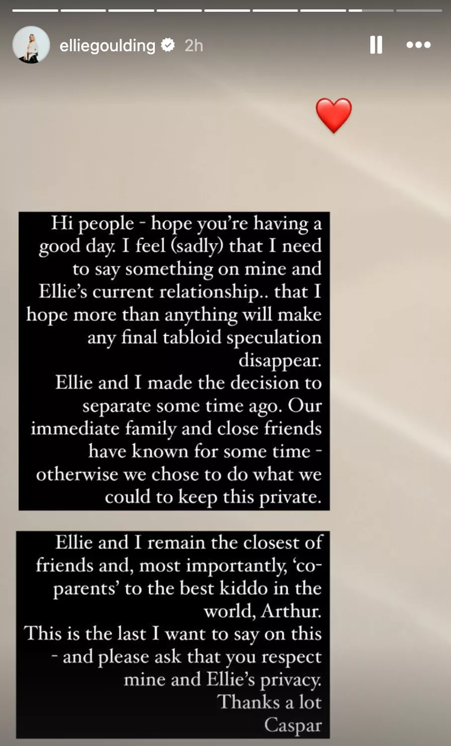 "Hi people - hope you're having a good day. I feel (sadly) that I need to say something on mine and Ellie's current relationship that I hope more than anything will make any final tabloid speculation disappear. Ellie and I made the decision to separate some time ago. Our immediate family and close friends have known for some time - otherwise we chose to do what we could to keep this private. Ellie and I remain the closest of friends and, most importantly, 'co-parents' to the best kiddo in the world, Arthur. This is the last I want to say on this - and please ask that you respect mine and Ellie's privacy. Thanks a lot, Caspar."