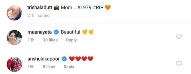 This isn’t the first time when Maanayata Dutt had commented on Trishala Dutt’s pictures as in December 2019, the latter had taken a trip down the nostalgic road and had posted a beautiful picture of her mother, Richa Sharma. Trishala had captioned it as "Mom... #1979 #RIP." To go by Trishala's caption, the picture of her gorgeous mom was around 30 years old. And what caught our attention in the comments section was Sanjay Dutt’s wife, Maanayata Dutt’s reaction to the picture. Maanayata had written, “Beautiful” followed by clapping emojis. (Also Read: Jaya Bachchan Praising Aishwarya Rai Bachchan Leaves Her 'Bahu' In Happy Tears In A Throwback Video)