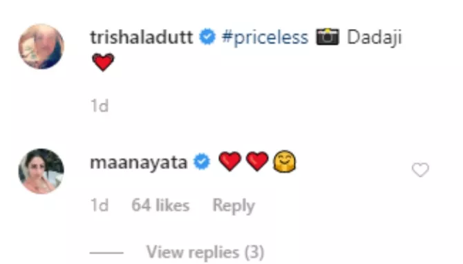 In January 2020, Trishala Dutt had taken the trip down the nostalgic road and had posted a ‘priceless’ picture with her ‘dadaji’, Sunil Dutt. Sharing the picture, Trishala had written, “#priceless Dadaji” followed by a heart emoji. To which, Maanayata Dutt had commented with an array of heart emojis. (Also Read: Boney Kapoor And Ex-Wife, Mona Shourie's Rare Picture With Son, Arjun From Anil Kapoor's Birthday)