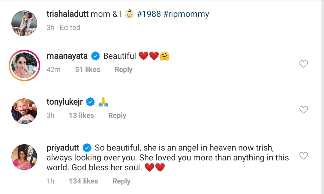 A few hours ago, Trishala Dutt posted a vintage photo of her late mom, Richa Sharma holding her then-newborn baby girl in her arms. The happiness on Richa’s face knows no bounds as she held her newborn daughter, Trishala in her arms, who slept peacefully while the newbie mommy was all smiles for the camera. Trishala captioned the picture as “Mom & I #1988 #ripmommy.” To Trishala’s throwback post, her stepmom and Sanjay Dutt’s third wife, Maanayata Dutt commented, “Beautiful” followed by heart emoticons. Sanjay’s sister and Trishala’s bua, Priya Dutt also commented, “So beautiful, she is an angel in heaven now trish, always looking over you. She loved you more than anything in this world. God bless her soul” followed by heart emojis.