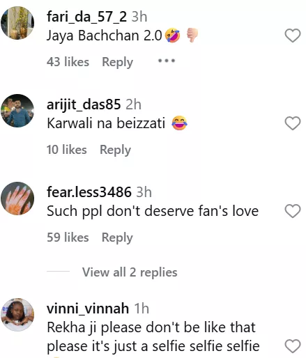 Rekha's cold behaviour towards the fan who asked for a selfie was not well received by her fans. One user penned, “I feel bad for the woman… what was so difficult about spending a few seconds for someone who considers you their fan?" Another user wrote that Jaya Bachchan and Rekha had no difference in their behaviour and penned, "Then what’s the difference between Jaya and Rekha?” Netizens found Rekha's behaviour to be 'very unkind' and fans noted of the actress treating the fan badly.