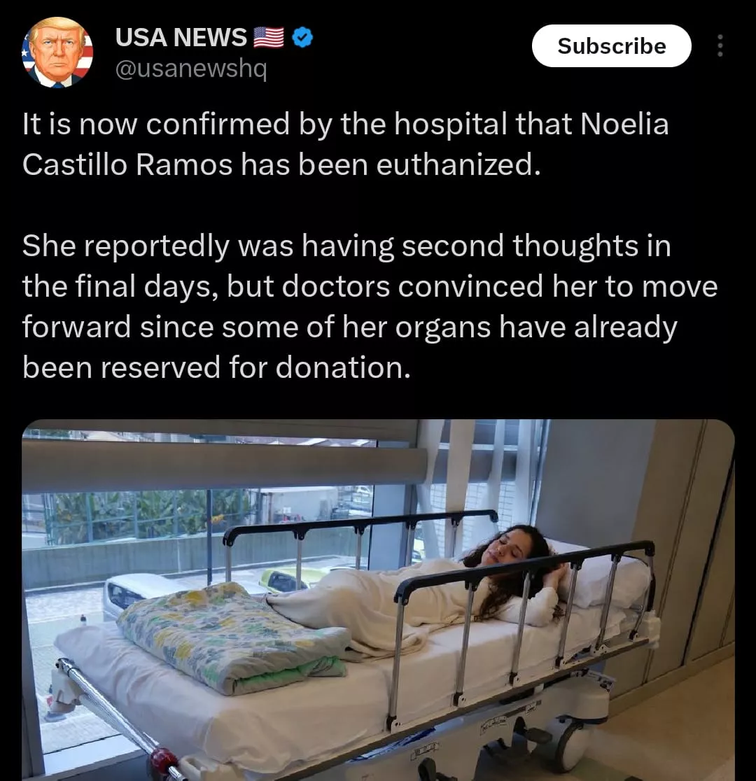 Polonia Castellanos, a lawyer representing the family of 25-year-old, Noelia Castillo Ramos, has alleged that a Spanish hospital pressured Noelia to proceed with euthanasia because her organs were "already committed" for donation. He claimed that when legal measures were sought to stop the euthanasia procedure in August 2024, the health centre told Noelia's mother it could not be postponed as they had already registered Noelia's organs for donation. According to the lawyer, these statements from the hospital led Noelia's mother to ask her daughter to sign a document stating she no longer wished to donate her organs. The lawyer's words (as translated from Spanish) can be read as: