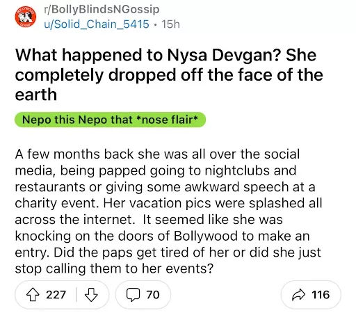 Nysa, who used to be all over the news with her IG posts and stylish appearances, suddenly went private with her life, so much so that she had even made her account private on IG. However, it confused the netizens, who, on the discussion platform, Reddit, started talking about the same. Some users thought that there was a possibility that Nysa got some plastic surgery done, while some other internet users mentioned that Ajay and Kajol's daughter has been trying to clear her public image.
