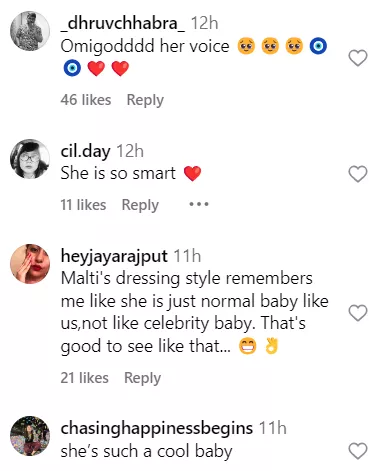 As soon as Priyanka dropped the beautiful moments from Malti’s first hike, netizens started penning their thoughts on the same. A majority of the online community just could not get over Malti’s sweet voice. Even many celebrities were in awe of the little one’s cuteness. One user wrote, “What a precious angel your daughter is. Sending love to you and your beautiful family, Priyanka.” Another one said, “omgggg gravs and malti are so cuteee!!” A third comment can be read as “Malti's dressing style remembers me like she is just a normal baby like us,not like a celebrity baby. That's good to see like that...”