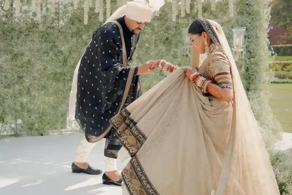 Bride Tanvi Singh established her new normal by donning a tone of beige at her wedding while her beau wore a black-hued outfit. Thanks to Sabyasachi’s bridal collection, the bride embraced a shade which, according to some, is not the most suitable shade to be worn for a wedding. However, Tanvi created a fashion statement that proved that even a neutral colour can look stylish and timeless. Look at the elegant and minimalistic detailing featured in this lehenga.