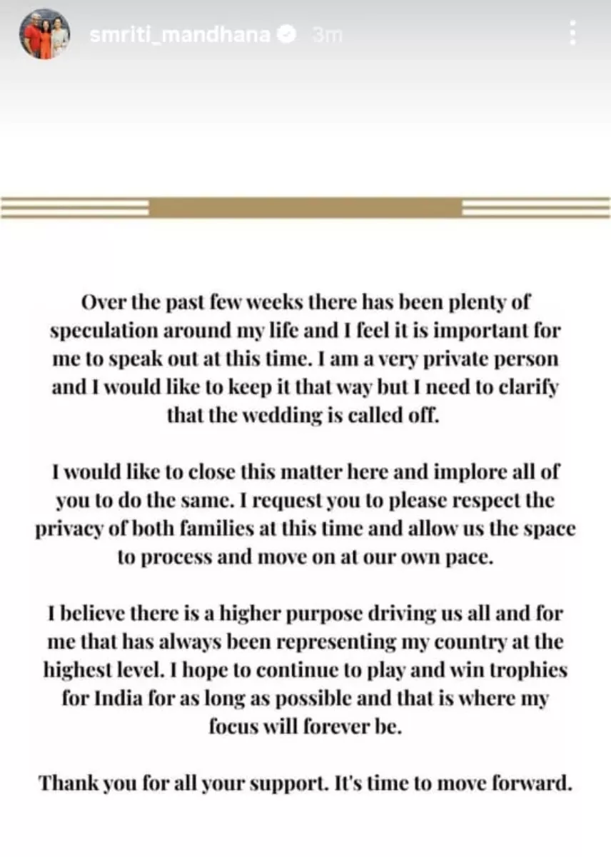 After a few weeks of speculations and unverified gossip claiming Palaash cheated on Smriti, the cricketer finally broke her silence on the same. She took to her Instagram stories and penned how her personal life became national news. However, she clarified that despite being a private person, she needed to make it clear that her wedding is called off. She wrote: