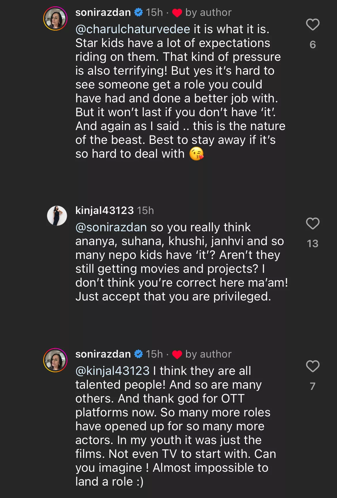 In another comment, Soni Razdan shared that star kids have a lot of expectations riding on them and that there's terrifying pressure on them. She also pointed out that it's difficult for actors to see someone getting a role that they think they could have done better. Another netizen asked Soni Razdan if she believes Ananya Panday, Suhana Khan, Khushi Kapoor and other nepo kids are talented. To this, Soni Razdan replied: