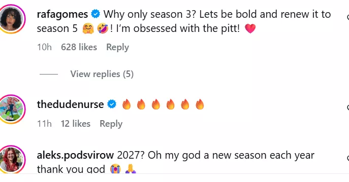 One user commented, "Why only season 3? Lets be bold and renew it to season 5! I’m obsessed with the Pitt." Another user commented, "2027? Oh my god a new season each year thank you god." A user wrote, "So nice to have comfort in knowing this show keeps some Hollywood jobs going!. Let’s get the industry back" A user also wrote, "Wow happy 3rd birthday to the staff of the Pizza Hut Taco Bell Trauma Medical Center (The Pitt for short)."