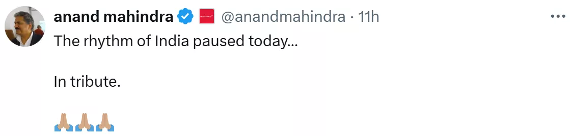 Renowned industrialist, Gautam Adani also reacted to Zakir Hussain's passing with an emotional note. The chairman of the Adani Group wrote, "The world has lost a rhythm it can never replace. Ustad Zakir Hussain, our maestro whose tabla beats will forever echo in the soul of India, leaves behind his inimitable form of timeless art. His legacy is an eternal taal, resonating through generations to come. RIP." Not only this, Anand Mahindra also penned a deep one-liner on Zakir Hussain's death, and it can be read as:
