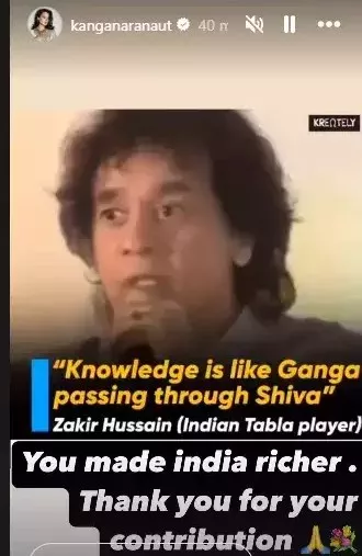 Bollywood actress, Kangana Ranaut shared a video of Zakir Hussain on her Instagram stories in which the late maestro was saying, "Knowledge is like a fast flowing river. And that river is passing through, just like Lord Shiva, Ganga passed through him". On top of the video, Kangana penned a note in which she thanked Zakir Hussain for his incredible contribution to Indian music. Her note can be read as: