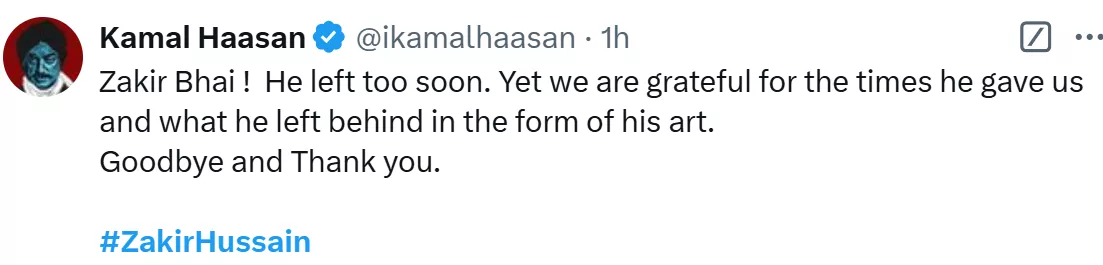 South Indian megastar, Kamal Haasan also reacted to Zakir Hussain's death and dropped an unseen picture from the past that is now doing rounds on the internet. The legendary tabla maestro and iconic actor could be seen jamming together, while Kamal Haasan could be seen playing the tabla, Zakir looked so happy at that moment. Along with the priceless picture, Kamal Haasan penned a note in which he shared that the musician left too soon. His note can be read as: