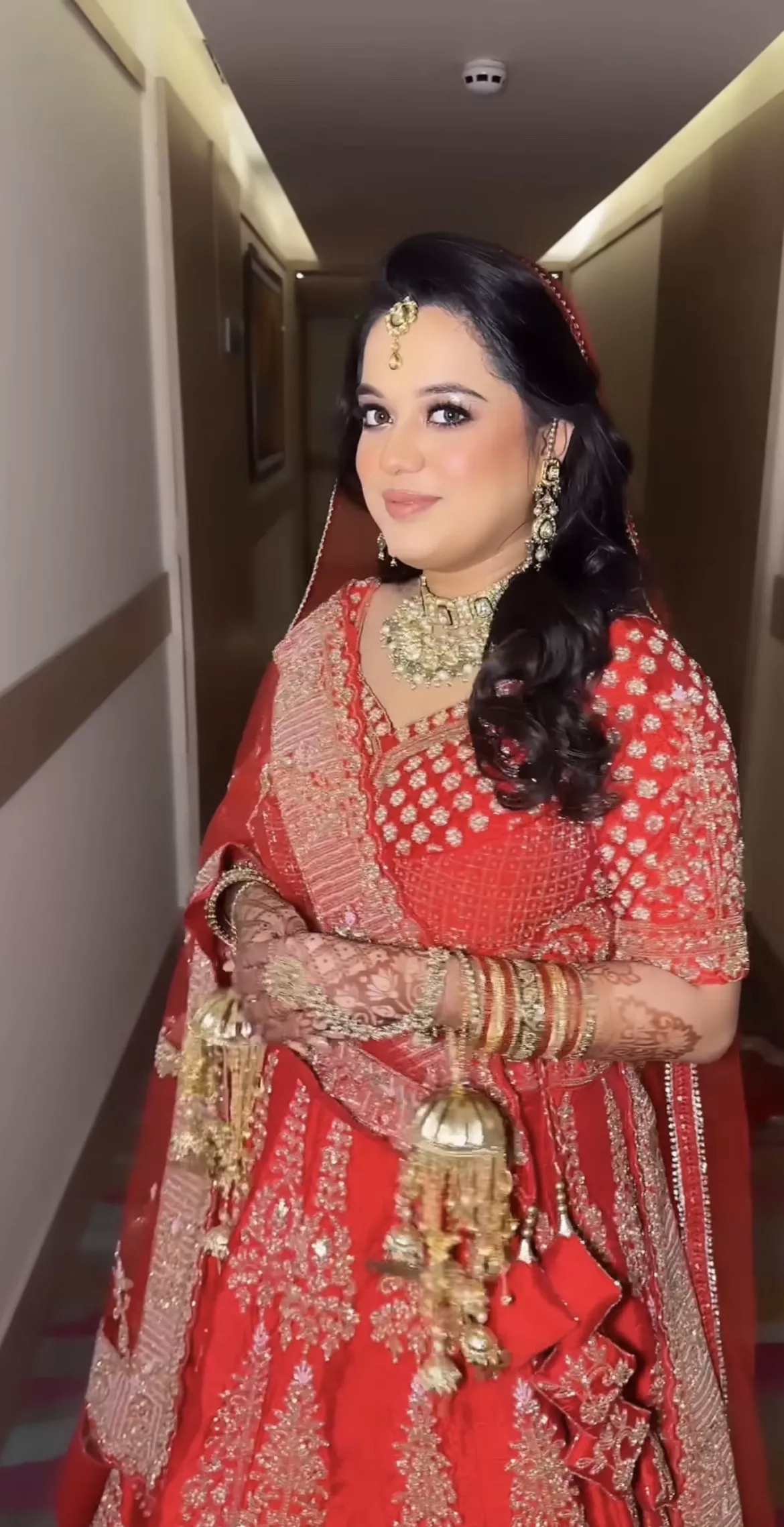 Sarah opted for a red-hued lehenga with golden embroidery for the wedding day. Her outfit featured a sweetheart neckline choli, a flared lehenga skirt, and a heavy dupatta beautifully pinned over her head. She ditched the bridal bun and opted for a curly hairstyle. Famous makeup artist, Kriti Das dolled her up for her biggest day.