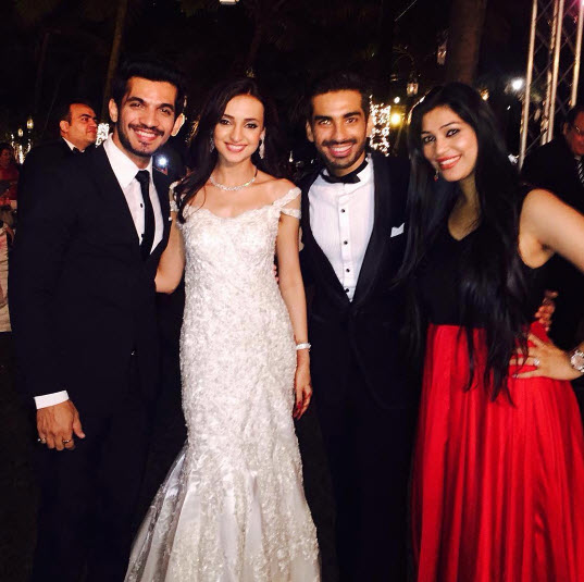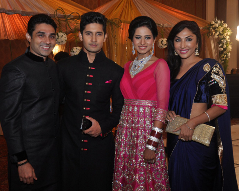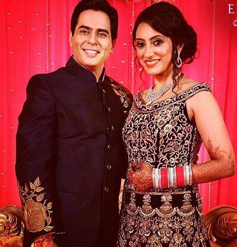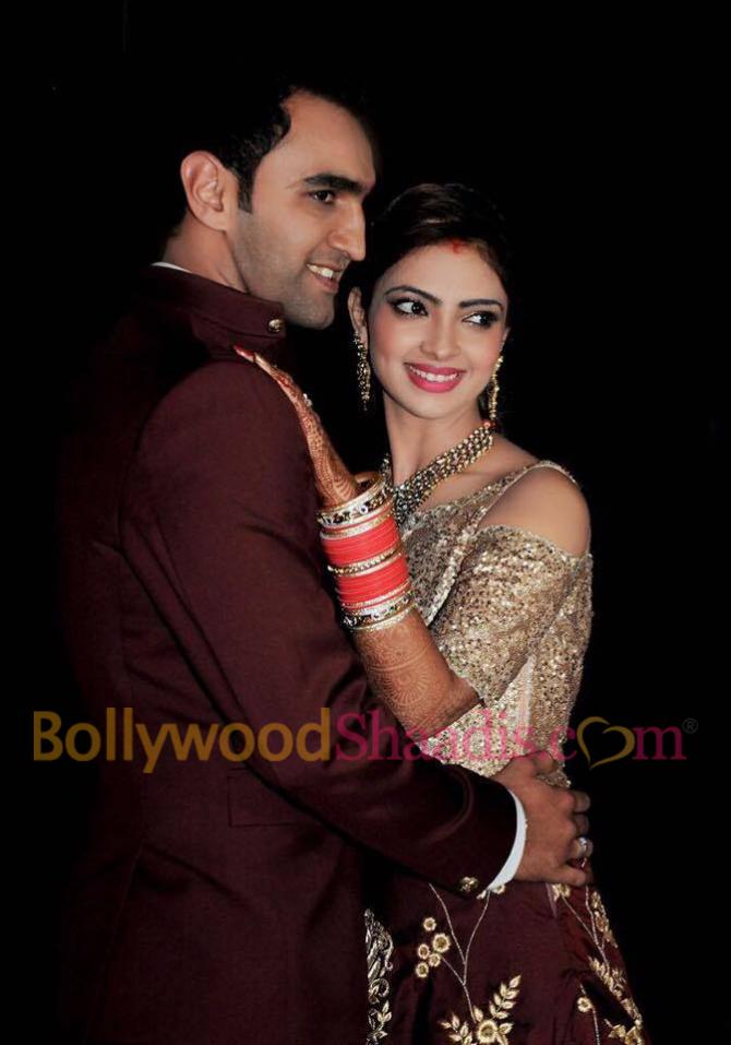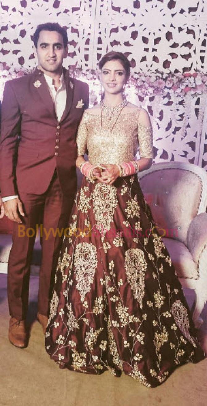 Vandana and Aman looked like a royalty couple at their wedding reception which was held in Mumbai. Vandana wore a boat neck navy-blue gown with heavy golden embroidery. The actress kept the rest of her look simple with just diamond jewellery, chooda and bun.