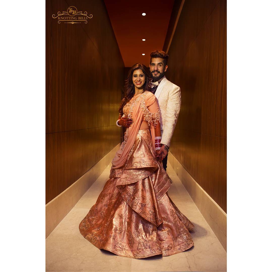 Sambhavna looked beautiful in her long studded peach and golden lehenga, which she wore at her reception in Hyatt Regency, Delhi. Her dress was made by popular celebrity designers, Hitendra Kapopara and Bhakti.