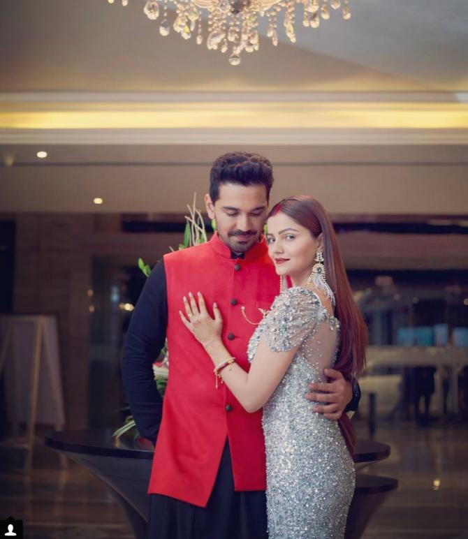 This latest addition to the list is one of the most beautiful and much-in-love couple of the telly town. The videos and pictures of the couple provide a hint of all the fun that the couple had at their wedding. Also, did you know? Rubina and Abhinav had two wedding receptions. One was in Ludhiana (Abhinav’s hometown), where Rubina wore a pretty grey shimmery bodycon gown with matching tassle earrings. Her hair was kept off her face, with her sindoor pretty visible, which further made her look like a proper beauty. Abhinav wore a black kurta-pyjama, which he complemented with a red short coat which we wore atop his kurta.