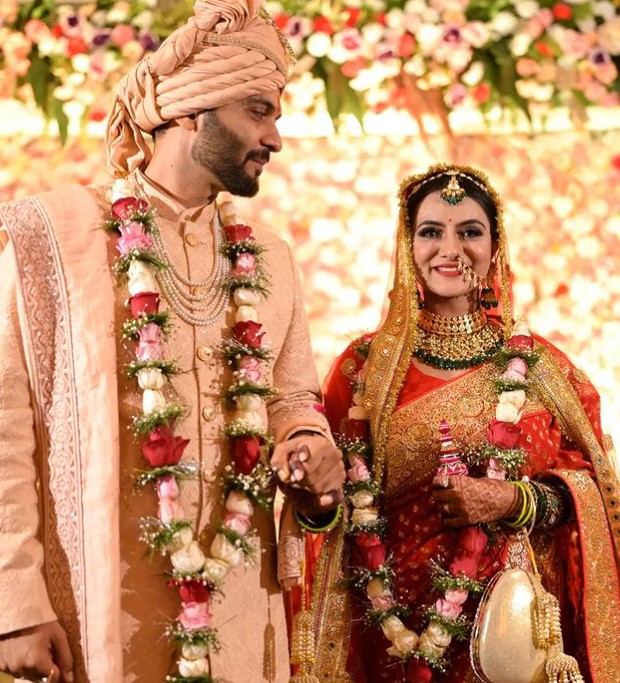 She accessorised her look with gold jewellery, which had green-coloured beads and stones. On the other hand, her groom complemented her in a peach-coloured sherwani. She captioned the pictures as:
