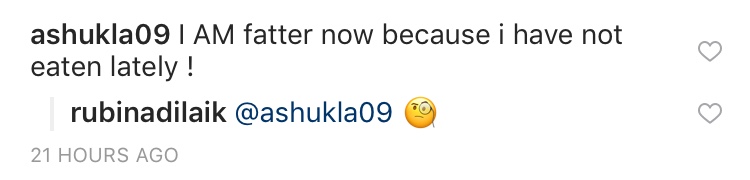 To this, Rubina’s lovely hubby chose to comment on the post and left a rather funny remark, which could be read as, “I am fatter now because I have not eaten lately!” And soon Rubina replied to him with a face with monocle emoji, as if she is questioning and pondering over his comment. Here, checkout the screenshot: