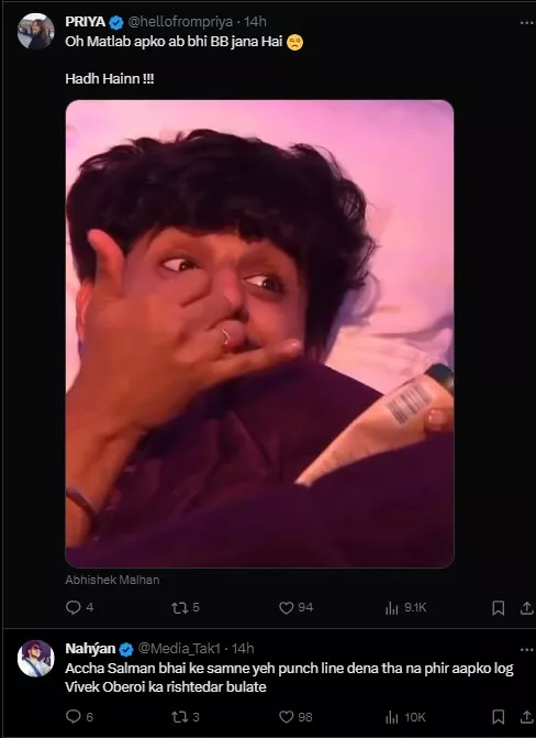 As soon as Abhishek Malhan posted the tweet, netizens rushed to the comment section to drop their opinions. While some took his comment in a playful way, others reacted angrily to his remark. Reacting to the tweet, one user wrote, "Jo mrzi keh do jeet tm ni skty.." Another user penned, "Agar aap aarhe ho to affidavit karwa lo. Ayushman Malhan, Not Bad." A third comment reads, "Accha Salman bhai ke samne yeh punch line dena tha na phir aapko log Vivek Oberoi ka rishtedar bulate." Check out the comments below: