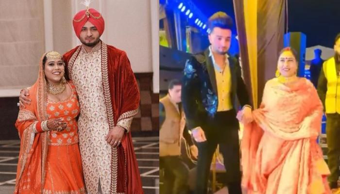 The newlywed singer, Afsana Khan has been quite active on social media since her wedding with her longtime boyfriend, Saajz. She recently dropped a series of priceless videos from her dreamy wedding. In the videos, Afsana looked gorgeous in an orange-hued lehenga. The singer accessorised it with an oversized maang teeka, a choker neckpiece and earrings. Her husband, Saajz, can be seen donning a cream-coloured sherwani and gold rust coloured doshala. The couple looked simply out of this world on their wedding day.