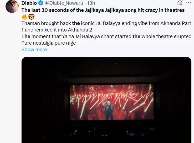 "The last 30 seconds of the Jajikaya Jajikaya song hit crazy in theatres. Thaman brought back the iconic Jai Balayya ending vibe from Akhanda Part 1 and remixed it into Akhanda 2. The moment that the Ya Ya Jai Balayya chant started, the whole theatre erupted. Pure nostalgia, pure rage, pure Balayya aura."