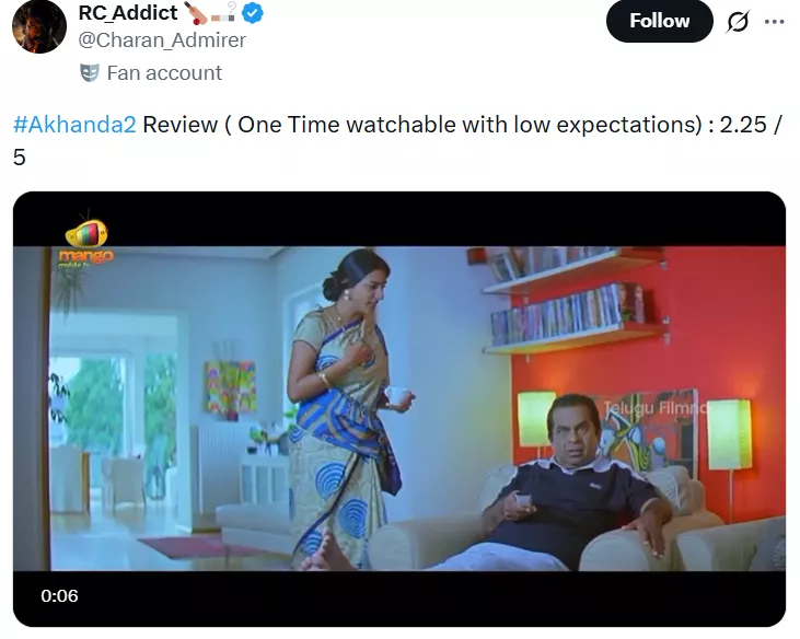 A comment read, "Akhanda 1 set the bar sky-high, and Akhanda 2 just couldn't match that legacy. Still, NBK's screen presence remains the biggest strength of the franchise." Other fans used memes to express their views on the film. An X user posted a clip from one of Boyapati and Balakrishna's Hindi promotions, in which the director says, "Already humne bol diya, already caution kiya." Another user posted a famous meme of Brahmanandam falling in shock as his wife tries to offer him coffee, writing, "#Akhanda2 Review (One Time watchable with low expectations) 2.25 / 5."