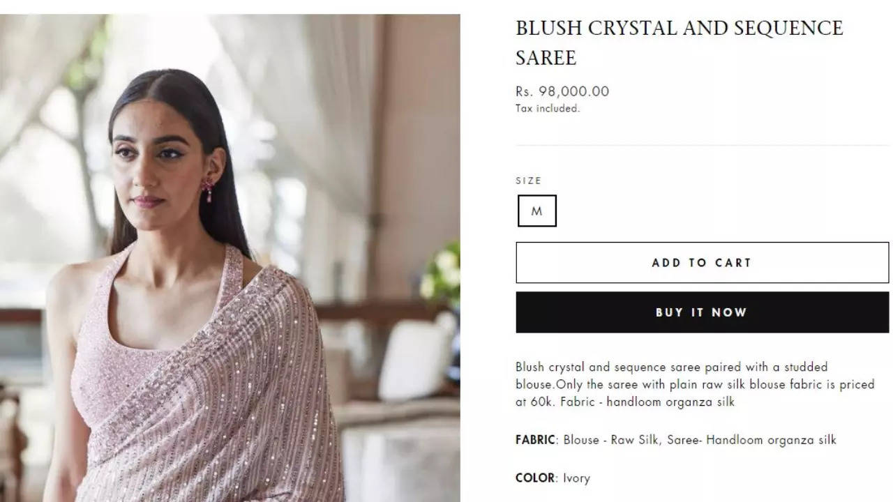 On February 28, 2022, celebrity fashion stylist, Lakshmi Lehr had taken to her Instagram handle and had shared a stunning picture of Alia Bhatt wearing a blush crystal and sequence saree from Sawan Gandhi's designer collection. The gorgeous actress had paired her look with a strapped blouse along with jhumkas. She had completed her look with subtle makeup by MUA, Puneet B Saini and had looked stunning. The blush crystal and sequence saree is available on Sawan Gandhi's official website and features a stone-studded blouse. The price tag of the whole attire comes with a whopping amount of Rs. 98,000. The website also mentioned that the fabric-handloom organza silk saree paired with a plain raw silk blouse is worth Rs. 60,000.