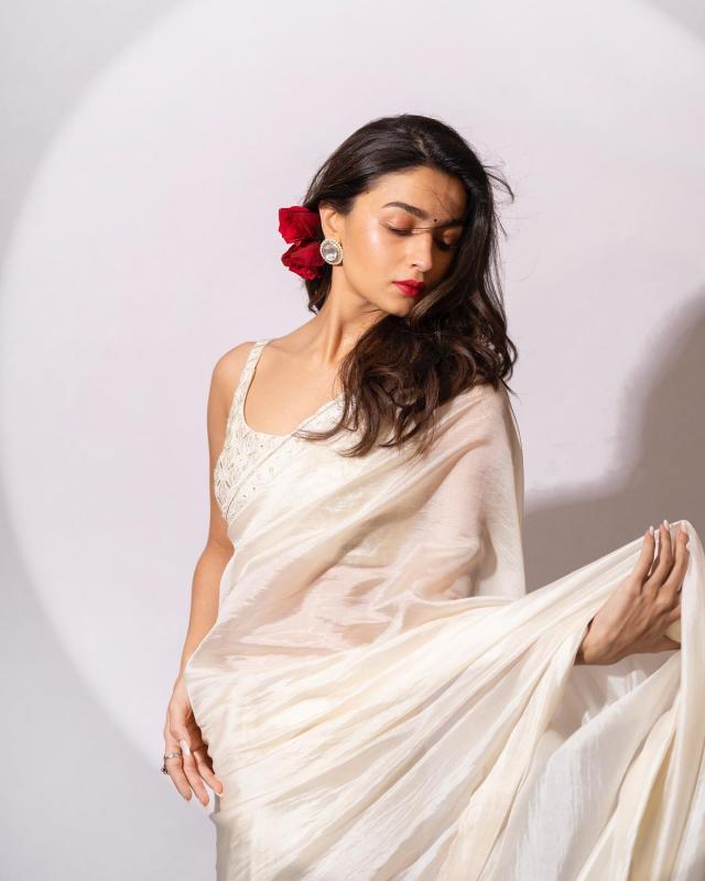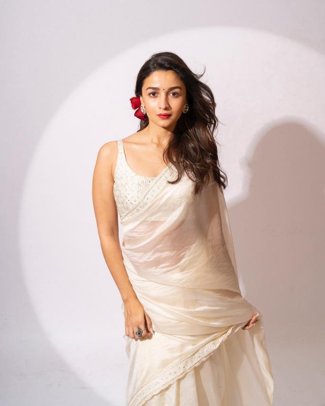 On February 8, 2022, for a promotional event, Alia had donned a beautiful ivory saree from the shelves of the ace designer, Punit Balana. The saree had featured the delicate coin embroidery and resham work on the border. She had styled her look with statement earrings.