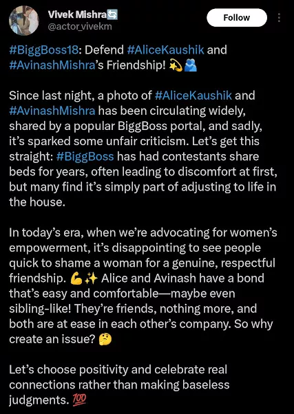 While some users are not happy about the clip, a significant section points out the irony of judging women in an era when people advocate for women's empowerment. In an X post, a user satirically wrote that Alice Kaushik, who claimed to be in a serious relationship and plans to get married, was cuddling and sleeping with Avinash. The X post showcasing Alice and Ashwin shared: