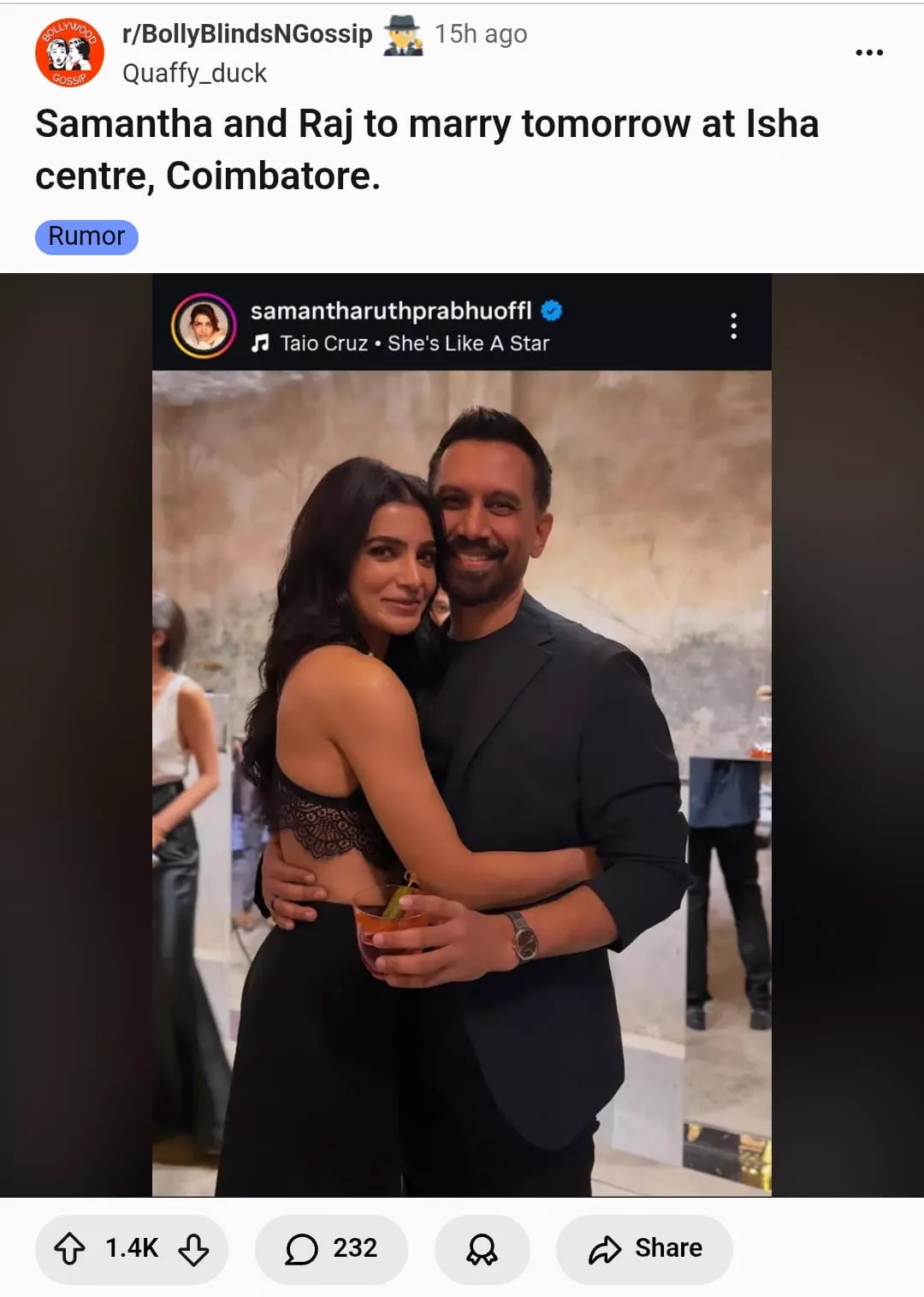 The internet is abuzz with discussions about the alleged wedding of Citadel: Honey Bunny star, Samantha Ruth Prabhu to Raj Nidimoru. Speculations began after an unverified claim surfaced on Reddit about the actress' plans for an intimate wedding today, on December 1, 2025. The Bollywood gossip page also shared alleged details regarding the wedding venue of Samantha and Raj. According to the post, the rumoured couple will tie the knot at the Isha Yoga Centre in Coimbatore. However, they did not mention anything regarding the guest list. Notably, the entire marriage buzz is just speculation, and there has been no confirmation from either Samantha or Raj Nidimoru.