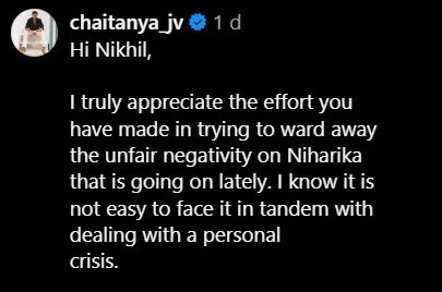 Recently, Niharika Konidela bared her heart out for the first time about her divorce. In an interaction on Nikhil Vijayendra Simha’s podcast, the diva, in a very dignified manner, talked about her personal life, wherein she stated how she wants to be independent and no longer wants to stay dependent on the wrong person. However, her ex-husband, Chaitanya JV didn’t hesitate and penned his side of the story. Taking to the comments, he asked the podcast host, Nikhil to not represent a one-way version of such a touching topic like divorce. An excerpt from his longish comment can be read as: