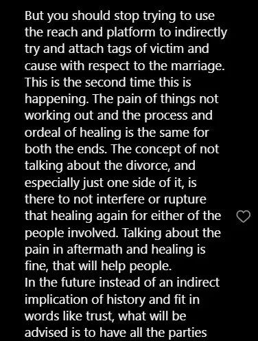 “But you should stop trying to use the reach and platform to indirectly try and attach tags of victim and cause with respect to the marriage. This is the second time this is happening. The pain of things not working out and the process and ordeal of healing is the same for both the ends. In the future instead of an indirect implication of history and fit in words like trust, what will be advised is to have all the parties involved and run through the timeline if you are that keen on knowing and making public aware.”