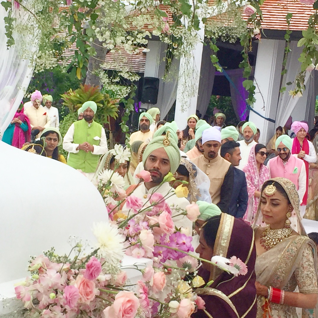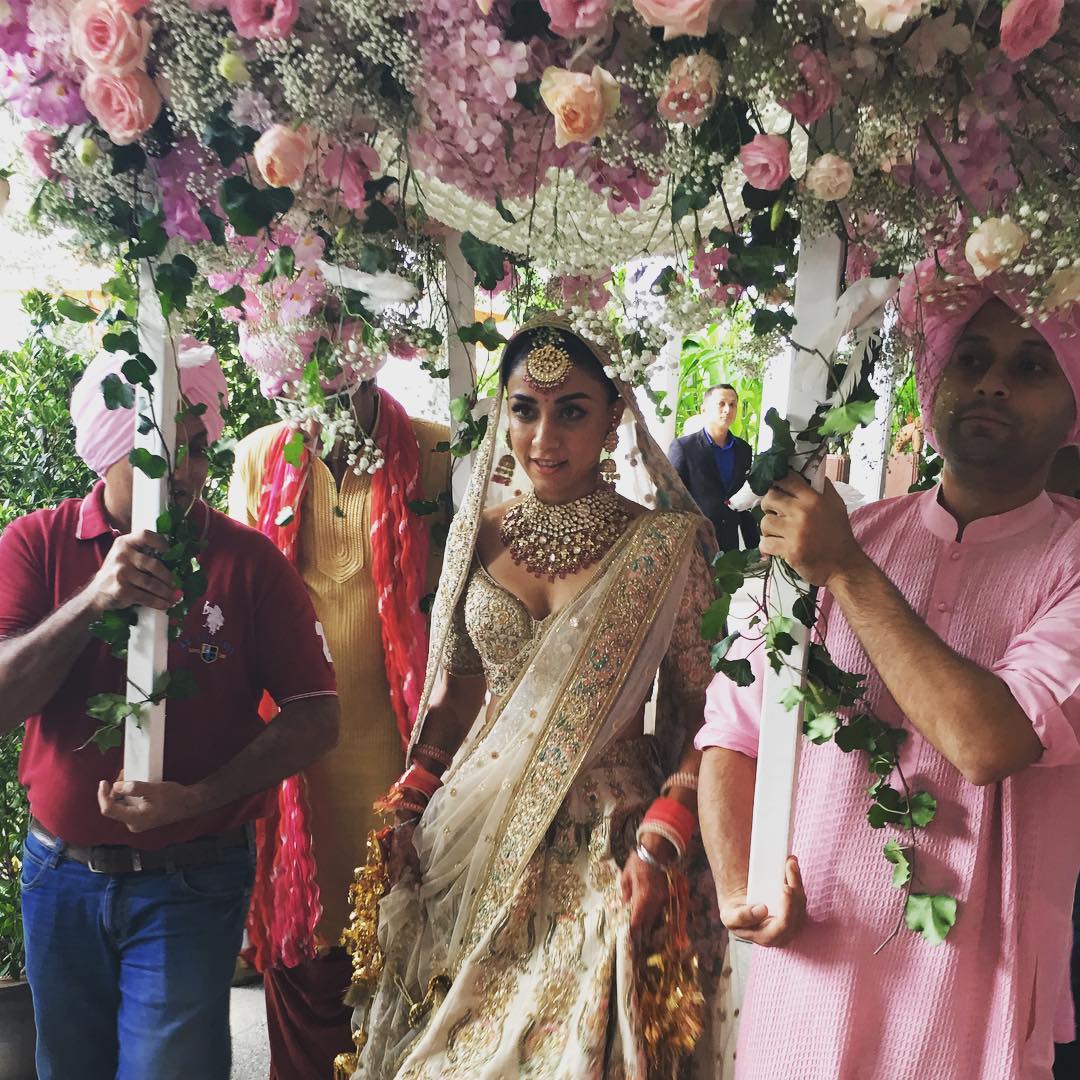 And without any disappointment, Amrita aced her wedding outfit with a heavily embellished bridal lehenga first and then a bright green coloured saree. Check out the eye-catching moment of Anand Karaj when Ms Puri stunningly entered in phoolon ki chaadar to become Mrs Sethi.