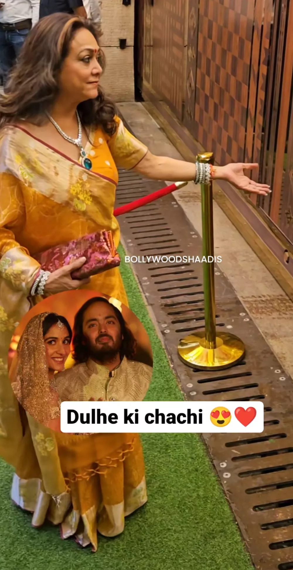 Recently, the paps spotted Anant Ambani's chachi, Tina Ambani, arriving at the celebrations. She was decked up in a mustard-hued saree with a broad golden border and beautiful yellow floral prints. She teamed her drape with a yellow blouse featuring silver embroidery. Open tresses, subtle makeup, diamond jewellery and a bindi complemented her look.