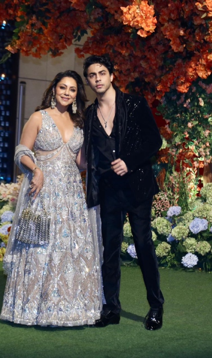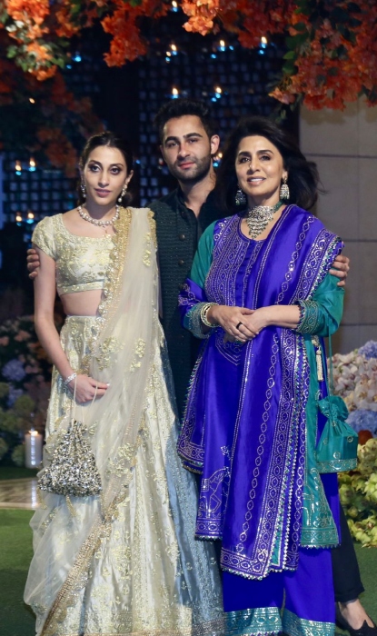 Bollywood's most adorable mother-daughter duo, Aishwarya Rai Bachchan and Aaradhya Bachchan also graced Anant and Radhika's engagement ceremony. The duo made heads turn as they entered the venue. The diva donned a green-hued anarkali adorned with heavy gota-patti work. She completed her look with a kundan necklace, a golden pouch and glam makeup. Her daughter, Aaradhya looked cute in a white-coloured anarkali suit featured with maroon-hued thread work. Her look was completed with a matching dupatta, a pair of dangling earrings, red lips, a small bindi and juttis.