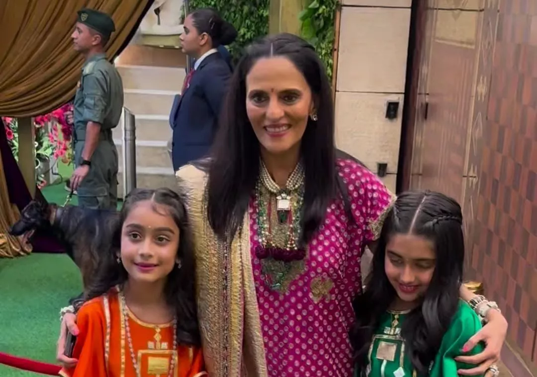 Ambani badi bahu, Shloka Mehta's mom, Mona Mehta was also present at Anant and Radhika's haldi. She was seen posing with her granddaughters, and the little ones looked cute in ghaghra choli. Mona Mehta opted for a Gujarati printed kurta style choli, and ghaghra, which she teamed with a dupatta. With heavy jewels and soft makeup, she finalised her look for the day.