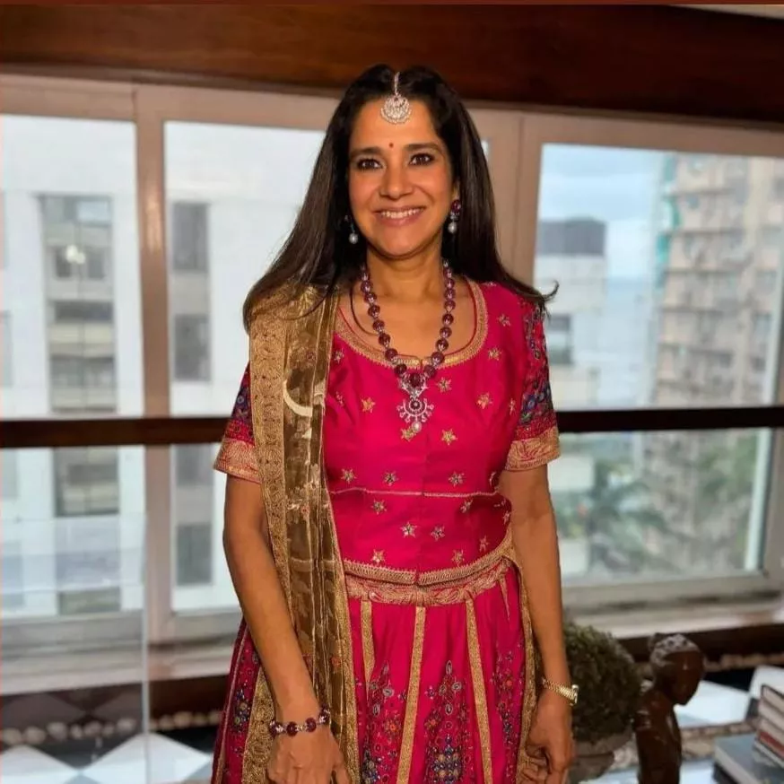 We also came across the stunning look for the day of Radhika Merchant's mom, Shaila Viren Merchant. For her daughter's mehendi ceremony, Shaila donned a pink-hued ghaghra choli. The lehenga had pannel work adorned with floral embroidery, while the choli had star motifs and the selves had blue-hued floral work. She teamed her ensemble with a golden dupatta. Along with her dress, Shaila opted for ruby-encrusted jewels, including a necklace, maang teeka, a bangle, a wristwatch, and matching earrings. Radhika's mom kept her look simple and finalised her look with a soft touchup, a half-tied hairdo, and a bindi.