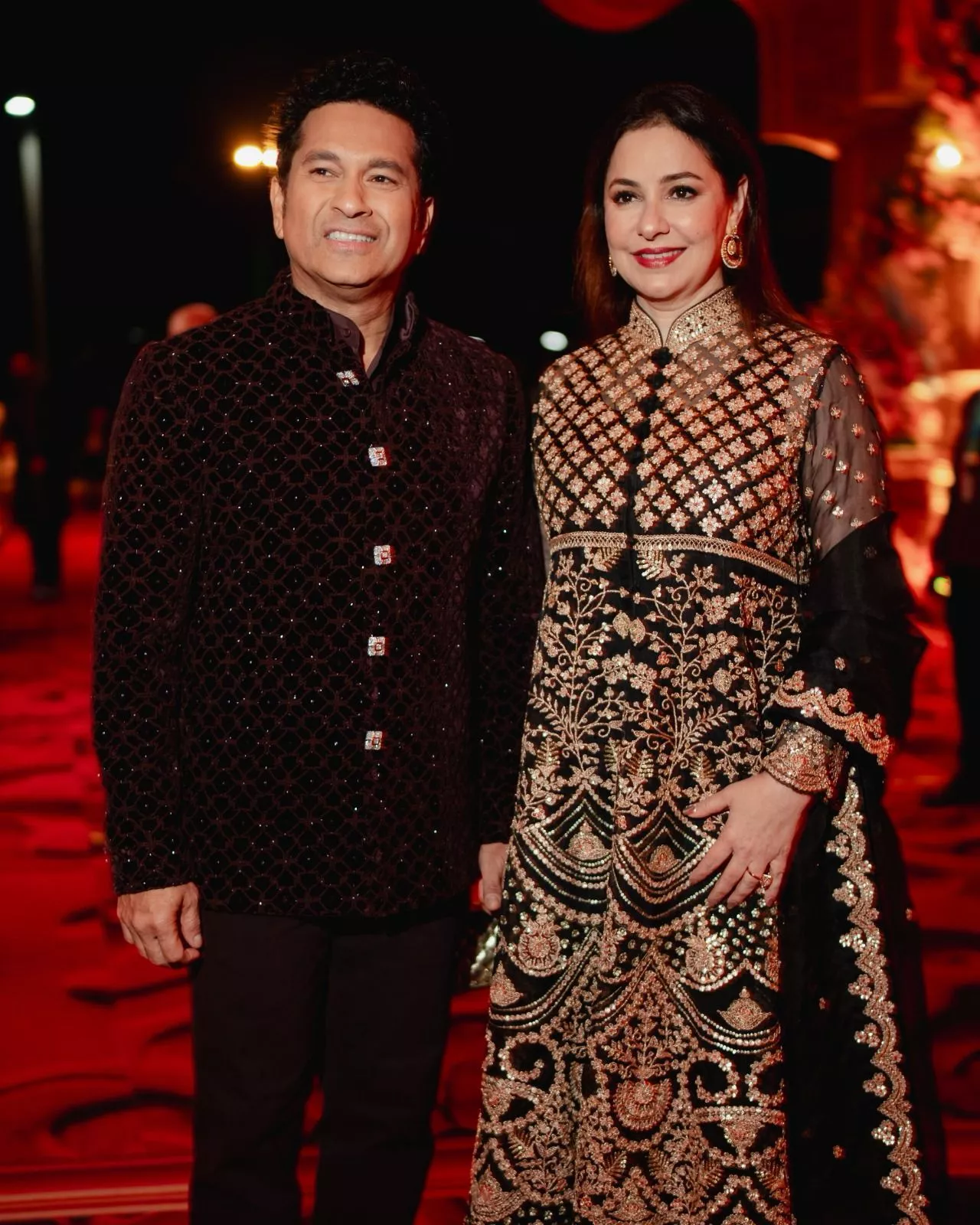 The former Indian cricketer, Sachin Tendulkar also has been in attendance of the three-day soiree with his family. For Day 2, the cricketer opted for an opulent black-coloured bandhgala adorned with maroon thread work. His wife, Anjali looked no less than a Bollywood actress in a black heavily embroidered Anarkali suit.