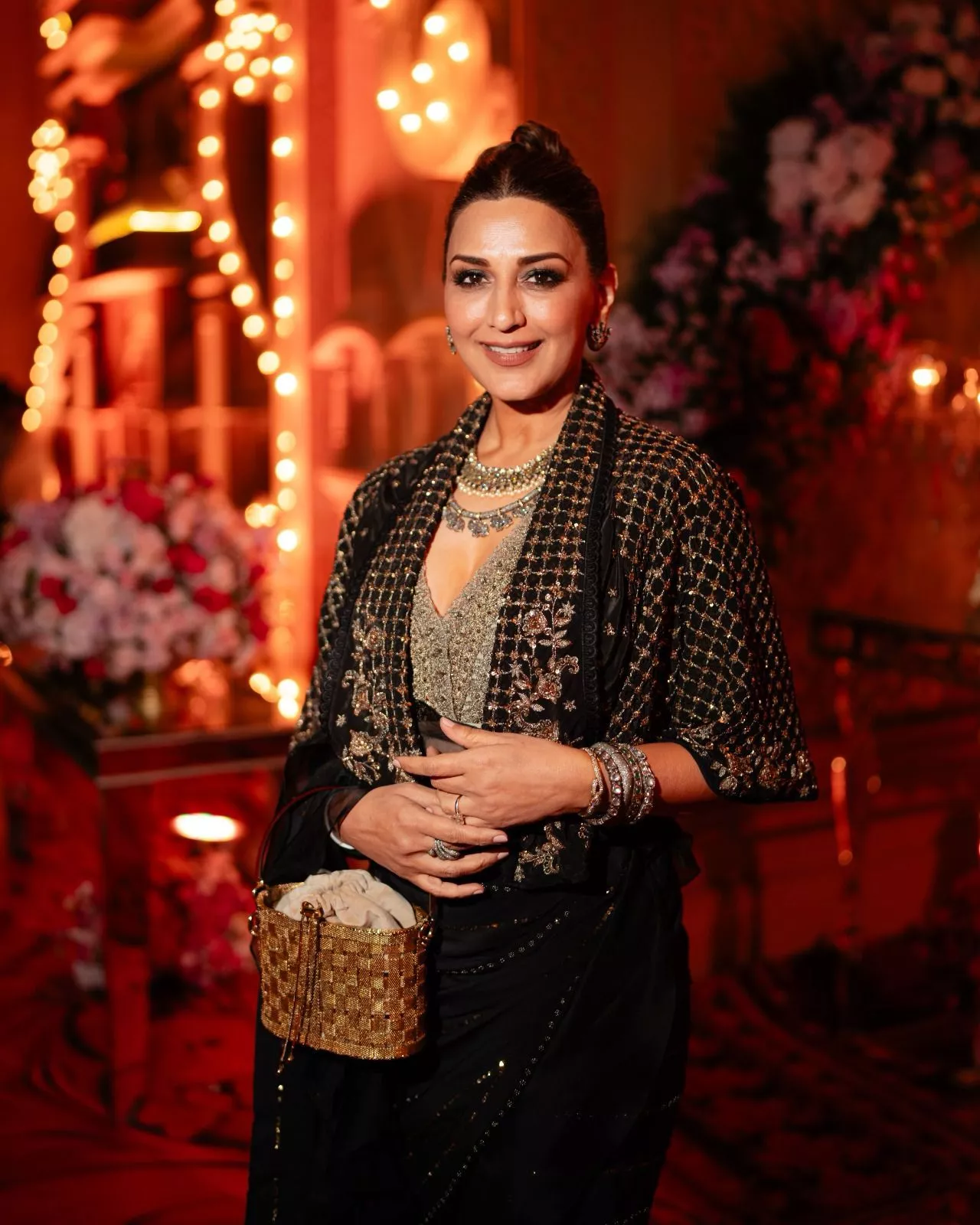 Popular Bollywood actress, Sonali Bendre mesmerised everyone with her stunning look in a gorgeous black saree, which had silver embellishments. She paired it with a matching blouse with a black cape. The cape had criss-cross patterns in gold color, adding a touch of elegance to her overall look. She accessorised her look with a layered neckpiece, dainty earrings, bangles and rings. Sonali tied her hair in a bun with a middle parting.