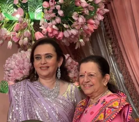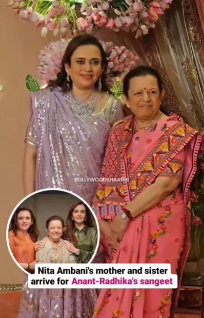 The guests have begun to mark their attendance at the Nita Mukesh Ambani Cultural Centre on July 5, 2024, to grace Anant Ambani and Radhika Merchant’s sangeet. We recently came across a glimpse of Nita Ambani’s mother, Purnima Dalal, making her way to the grand venue, along with her daughter, Mamta Dalal. Purnima, who recently turned 85, picked up a blush pink-hued saree, that featured intricate Kathiawadi floral embroidery all over it. The threadwork included yellow, maroon, pink and white floral motifs, and also featured a broad border on all sides.