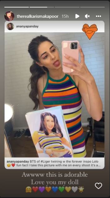 On August 2, 2022, Ananya Panday took to her IG handle and shared a cute mirror selfie of herself from the sets of her film, Liger. In the picture, she was twinning with Karisma Kapoor's picture from a 90s photoshoot. Both were seen donning a multi-coloured striped ensemble. While Lolo looked cute in two ponytails, Ananya completed her look with dewy makeup paired with a single ponytail. Sharing the picture, Ananya mentioned that she takes this picture of Karisma on her every shoot and it gives her pure inspiration. She wrote: